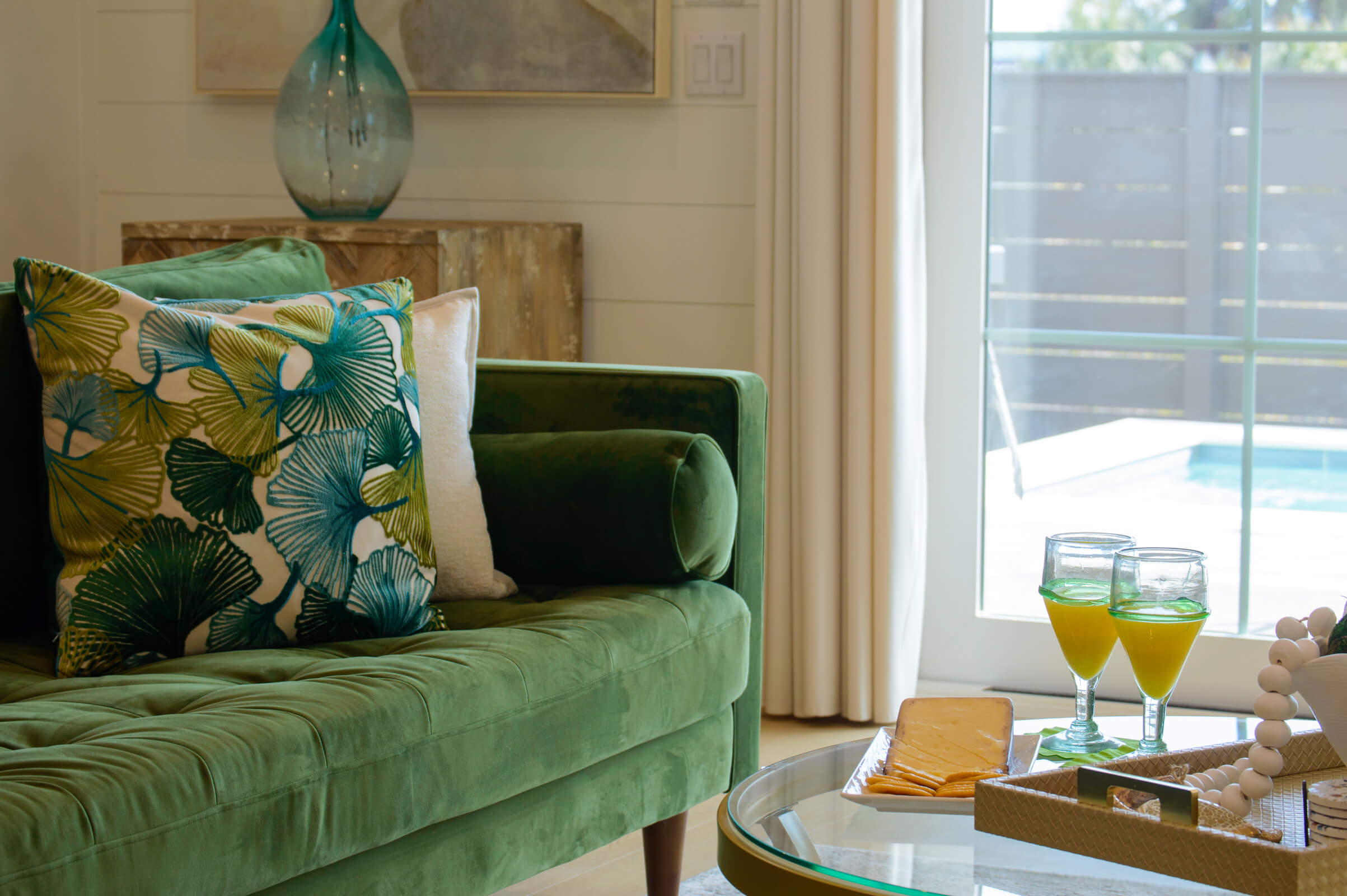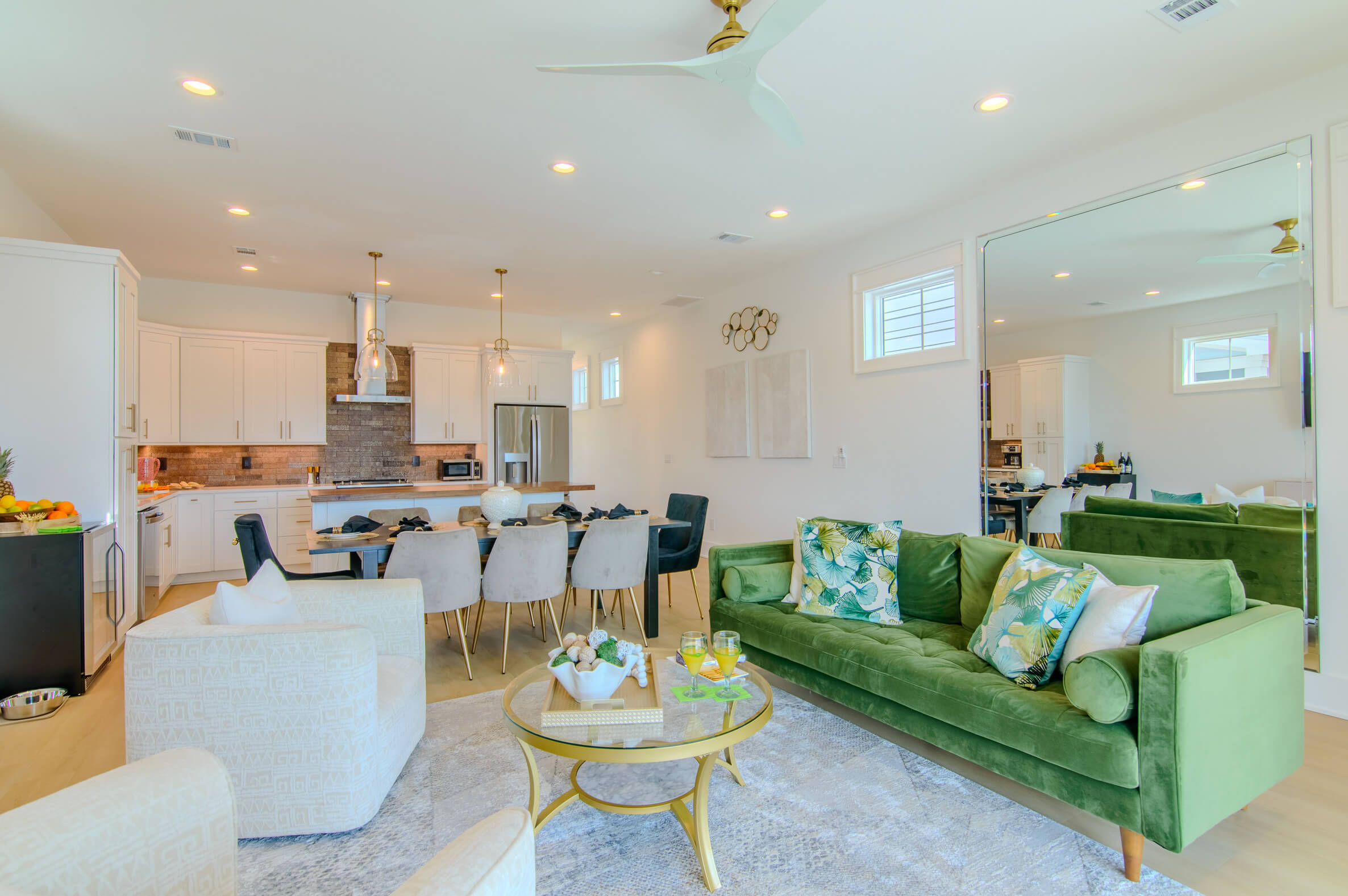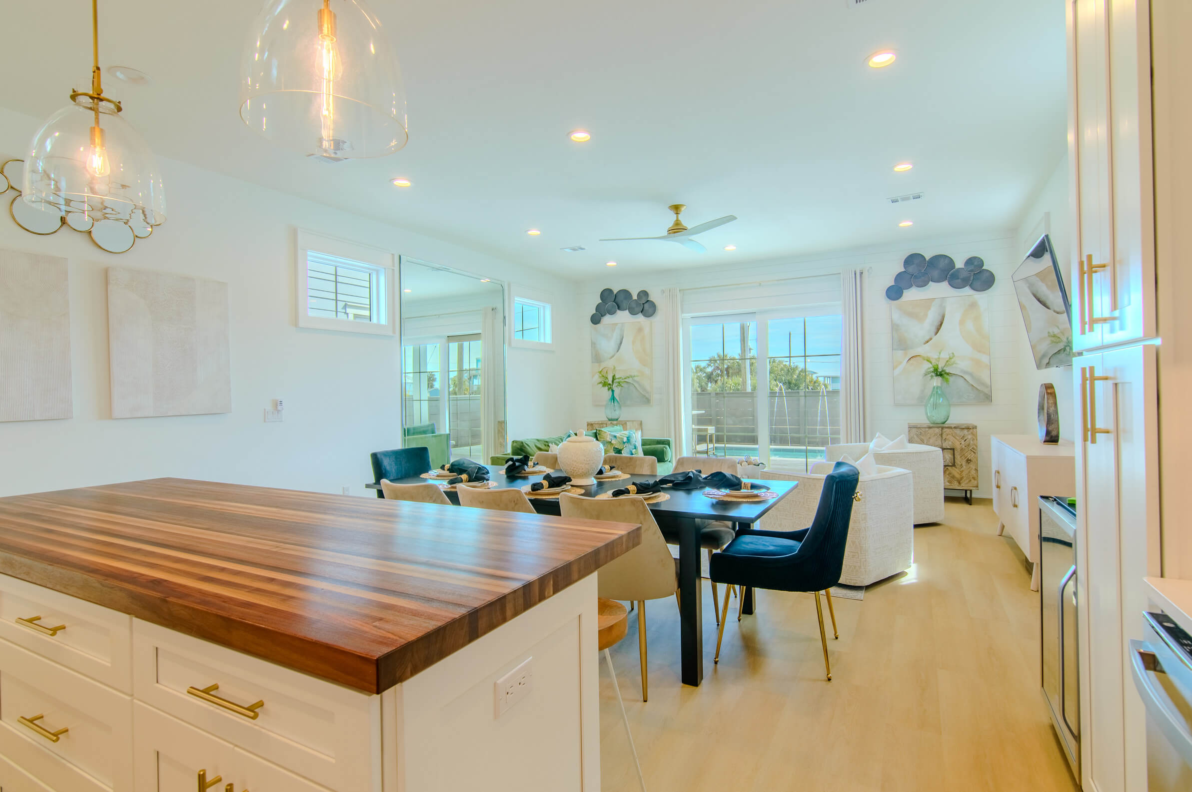 A beautiful sunny, open space that features high ceilings, designer furniture, smart TV, large glass doors that open to the pool, patio area with views of the Gulf of Mexico.