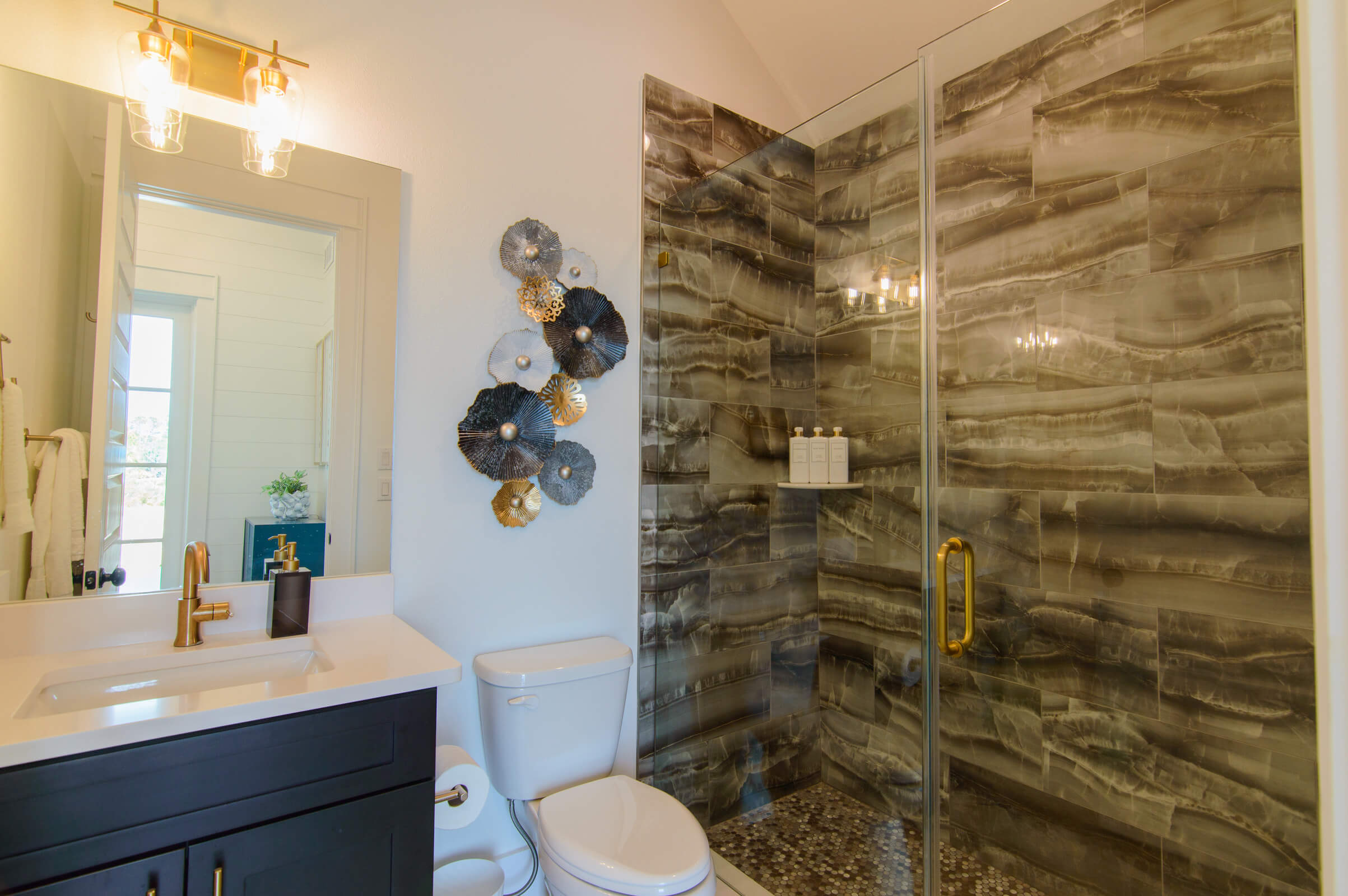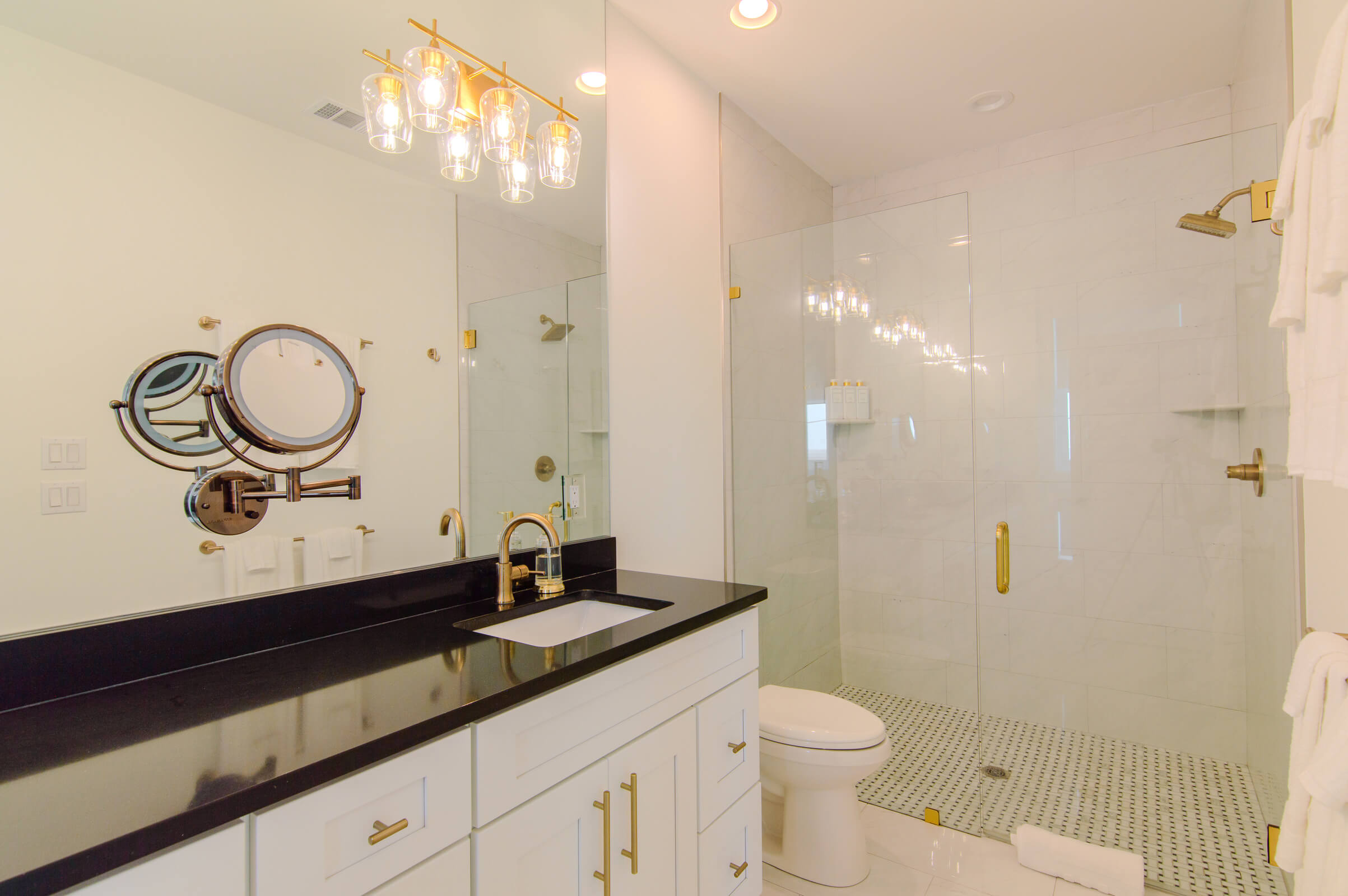 High-end finishes with a single vanity and large walk in shower