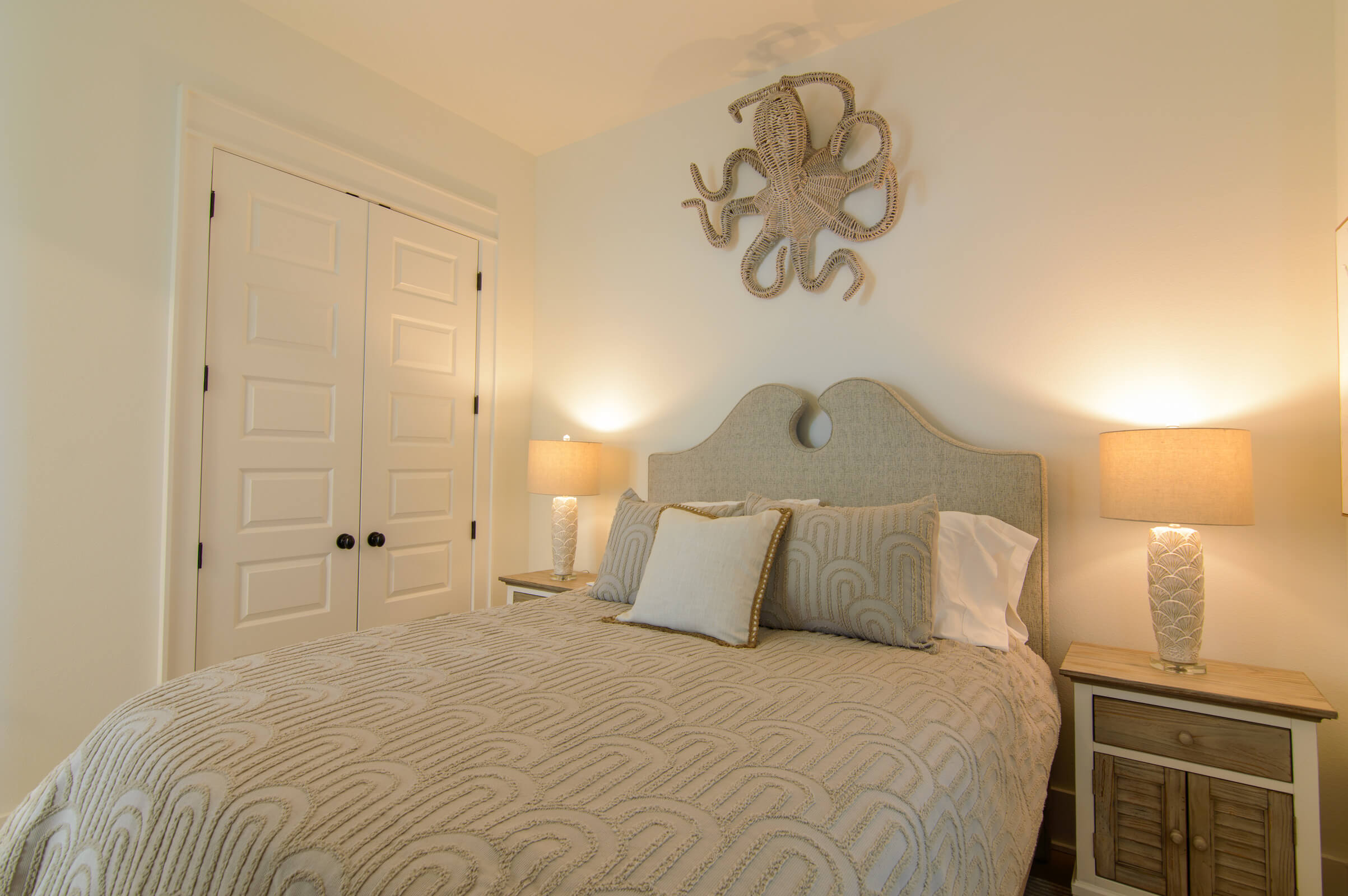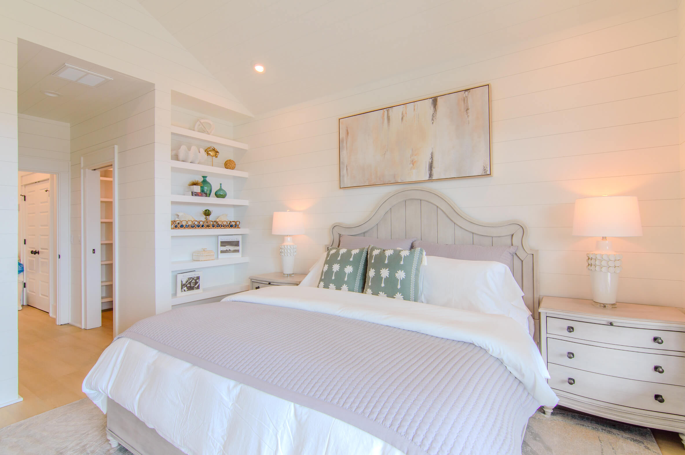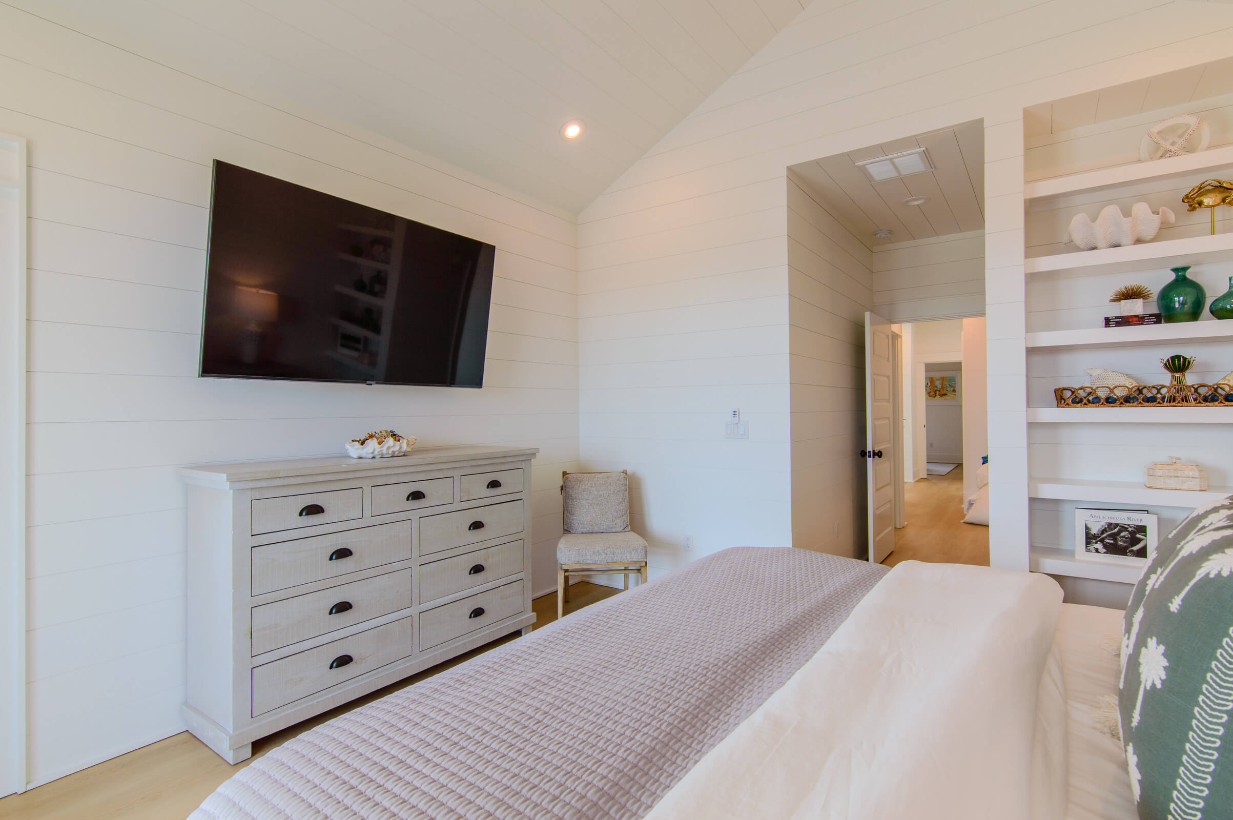 King bed ( top quality) with high vaulted ceilings, mounted TV, private balcony with views of the gulf, and a magnificent private bath .