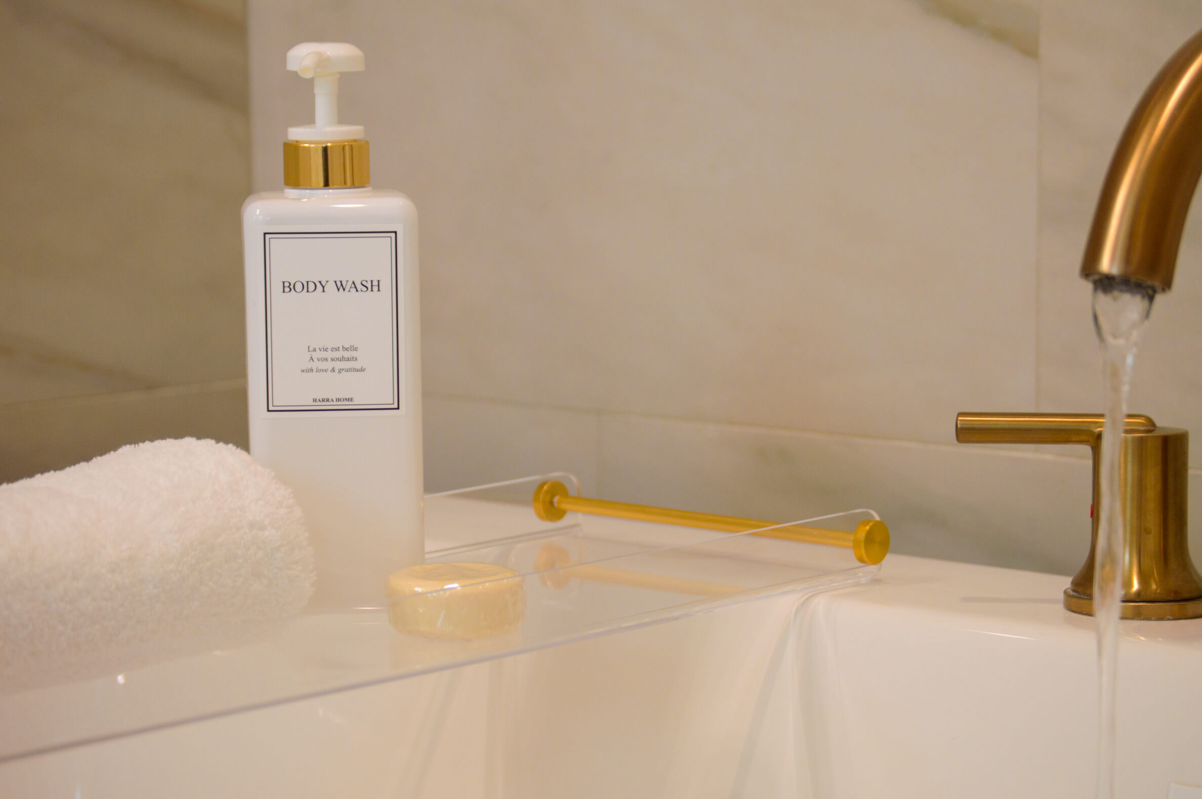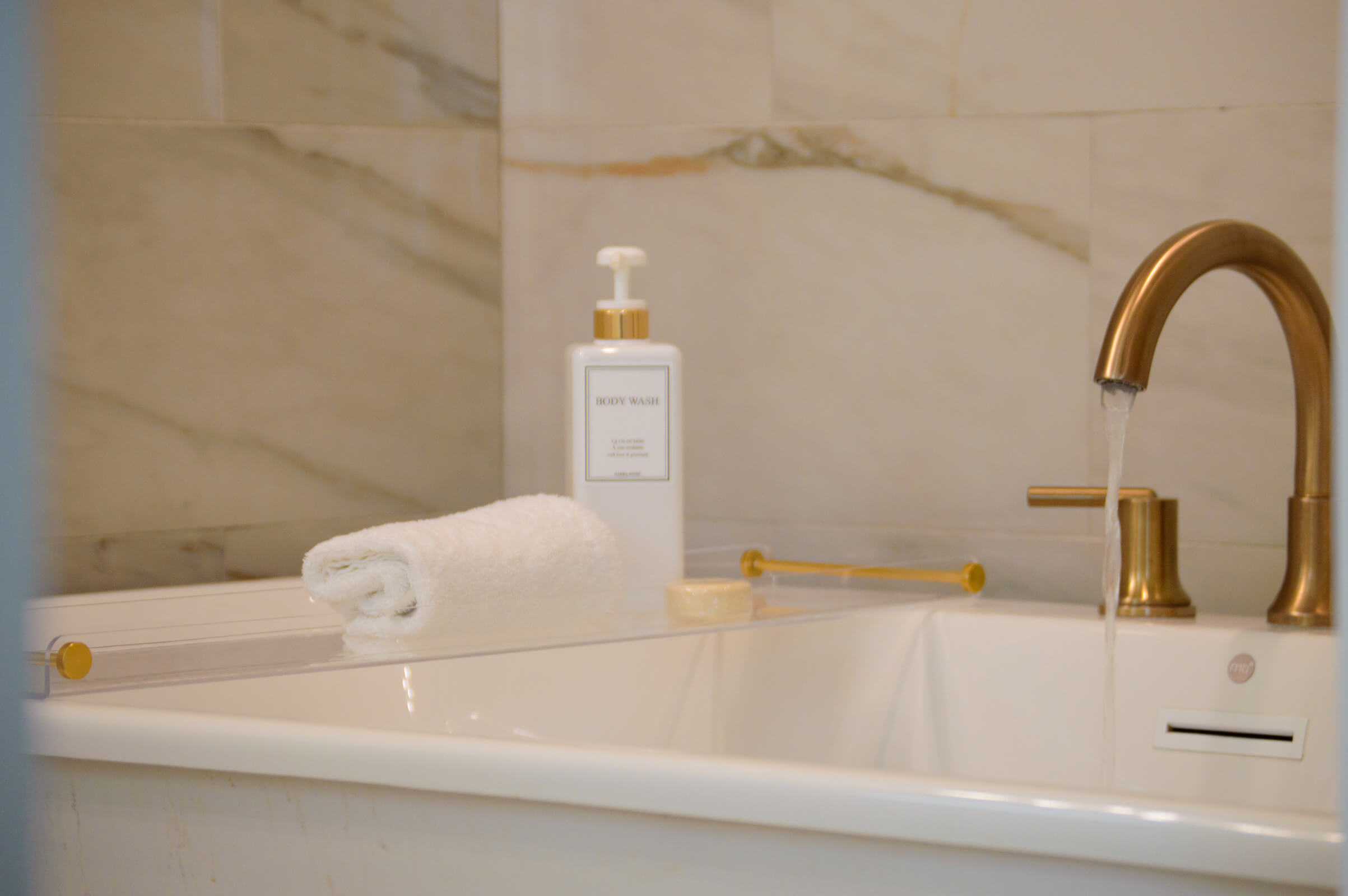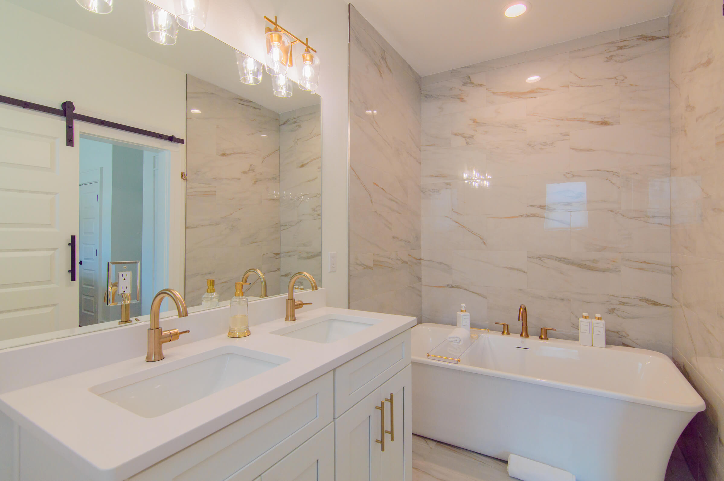 Luxe bathroom with beautiful finishes, double vanity, freestanding soaking tub ( shower option is in the Bathroom #3)