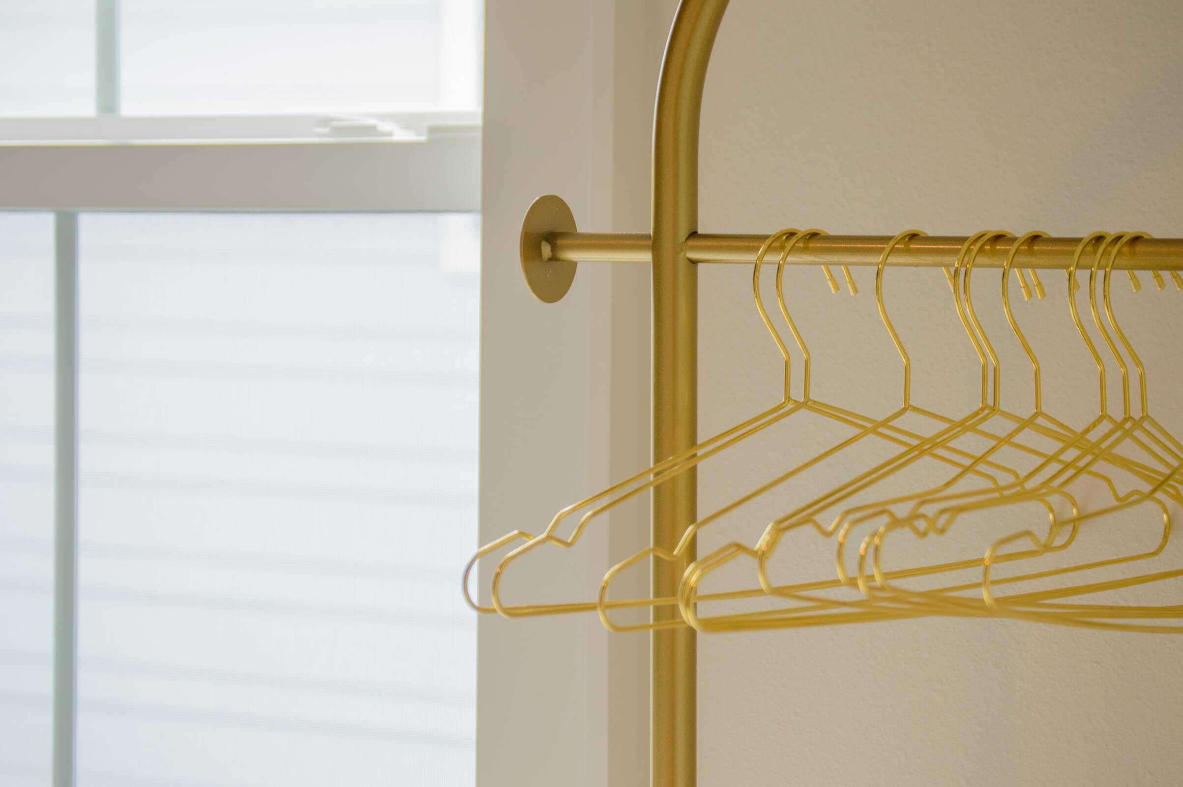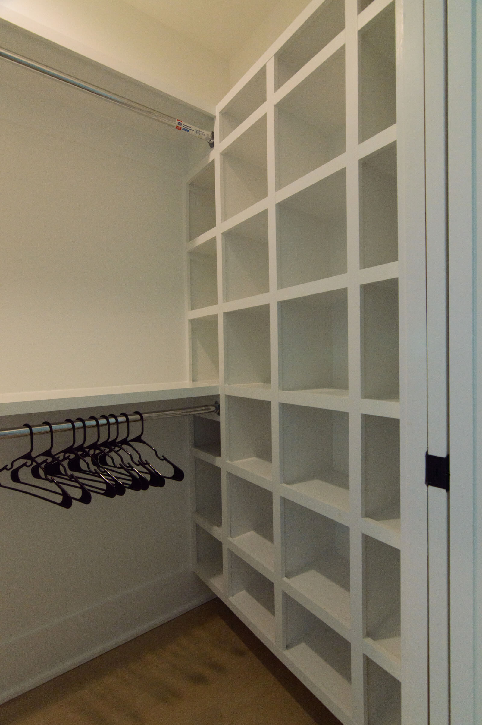 This bedroom also features build in storage and a freestanding hanging rack and a private bathroom.